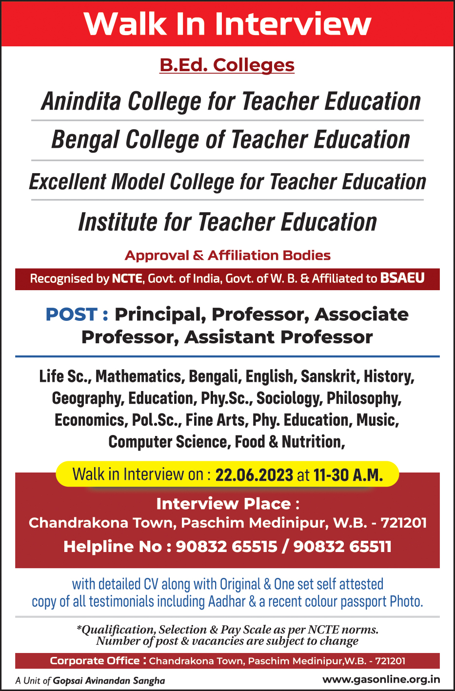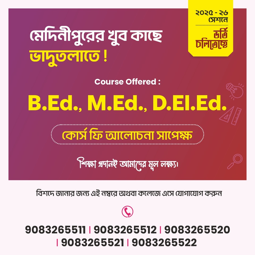BCTE, renowned in Paschim Medinipur and one of the most reputed B.Ed. colleges in West Bengal, promoted by Gopsai Avinandan Sangha, was established in 2007 with a firm commitment to foster a holistic approach to facilitate and promote studies and research in emerging areas of Education. Aim being to achieve excellence in the Educational field towards development of Education in the era of globalisation. The institute is affiliated to the Baba Saheb Ambedkar Education University (BSAEU) & Central Sanskrit University (CSU) and recognized by National Council for Teacher Education (NCTE).